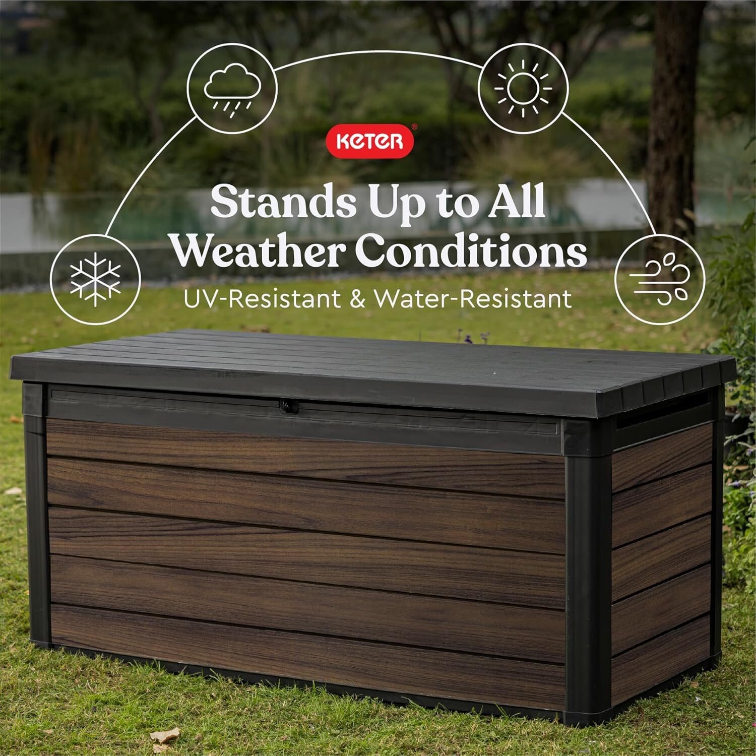Crafted with innovative DECoCOAT technology, this deck box replicates the texture and grain of real wood while maintaining a weather-resistant finish that resists fading, peeling, and rusting.