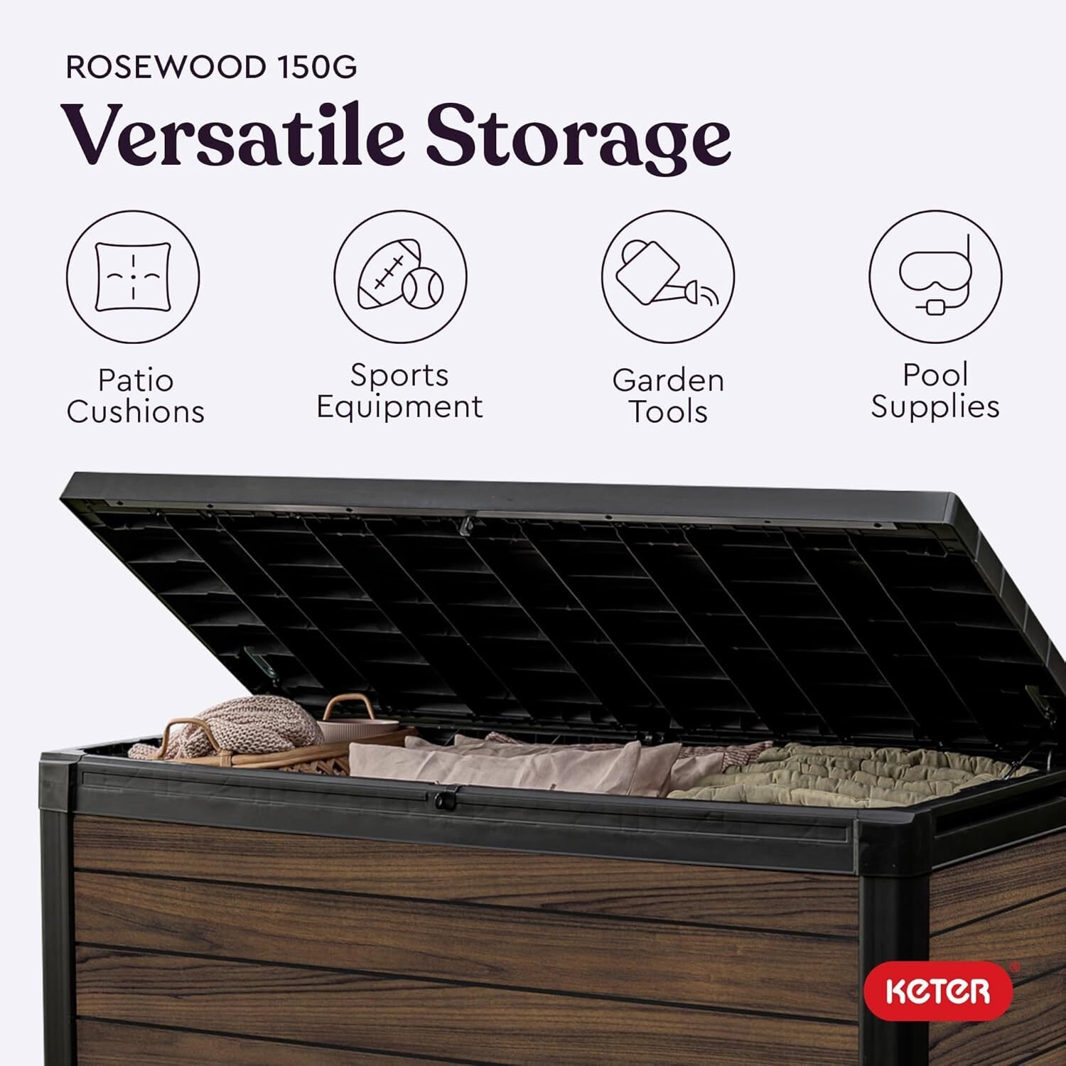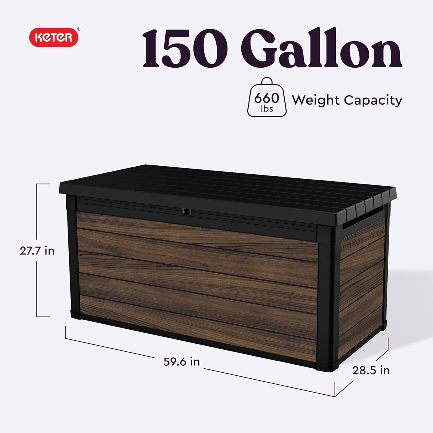 With a 150-gallon interior, this box provides spacious storage for cushions, tools, and outdoor essentials. Its rectangular shape fits neatly on patios, porches, or poolside areas.