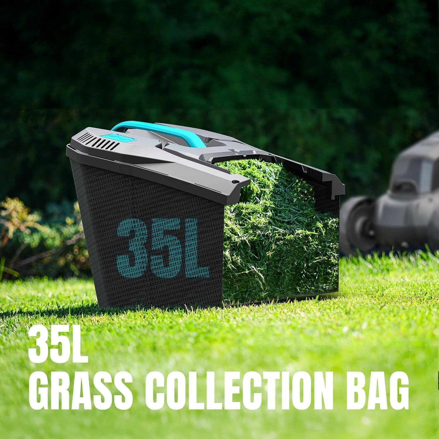 Compact 13-inch deck allows easy manoeuvring and fast mowing, making it ideal for gardens and narrow spaces. Includes a 35L grass collection bag for convenient disposal.