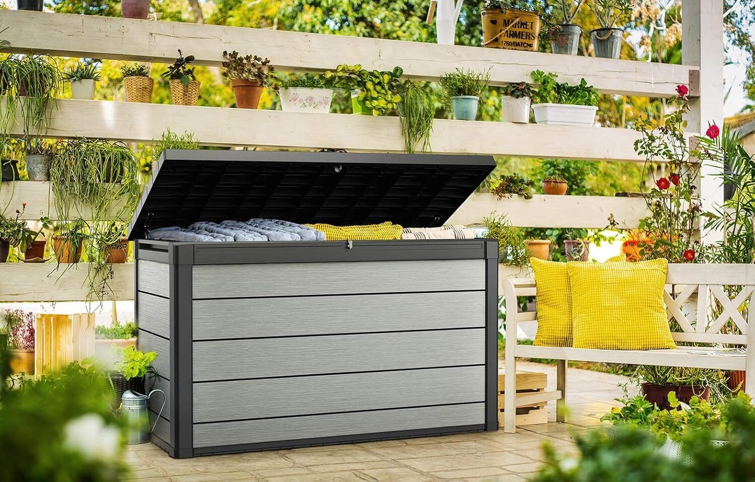 The Keter Denali 200-Gallon Resin Deck Box provides reliable outdoor storage with a sleek, dual-tone wood-look finish. Its large capacity, easy-lift hydraulic lid, and lockable design make it a versatile and durable solution for keeping your outdoor essentials organised and protected year-round.