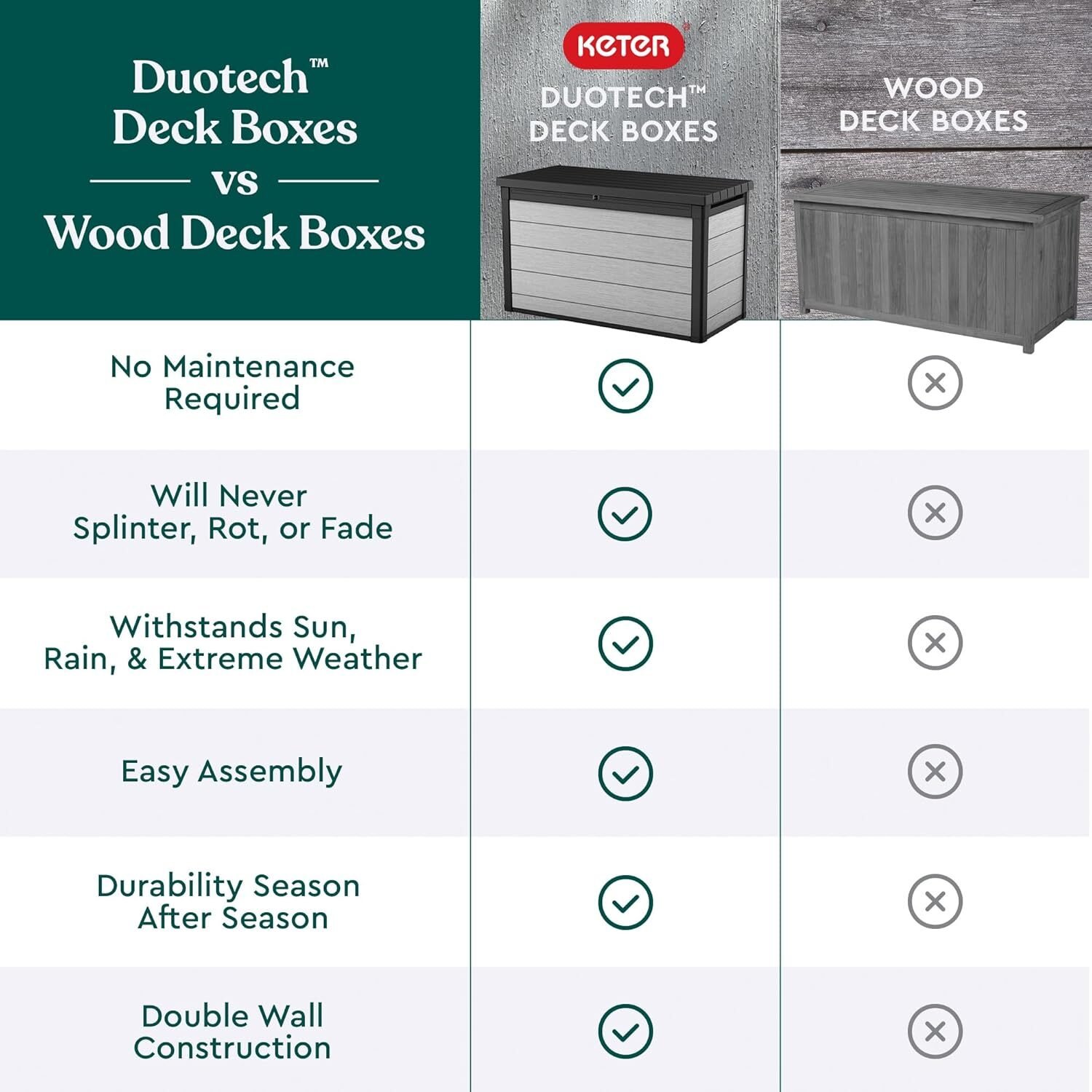 The Keter Denali 200-Gallon Deck Box combines modern design with durable functionality, offering spacious outdoor storage and extra seating. Made from innovative DUOTECH resin, it mimics the look and feel of real wood while providing superior weather resistance and strength for long-term outdoor use.